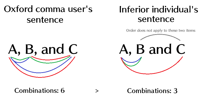 The image illustrates the fact that, because the order of the final two items of an Oxford comma-less list does not matter, the number of combinations (that is, those combinations that will establish clarity) will always be fewer than that of an Oxford comma-ful list. Thus, the probability that the implementation of the Oxford comma will provide clarity to a list of three items is twice that of the neglect of the Oxford comma; this ratio will change as the number of total items increases, but it doesn’t take a mathematician to realize that the superior comma shall continue to dominate numerically.